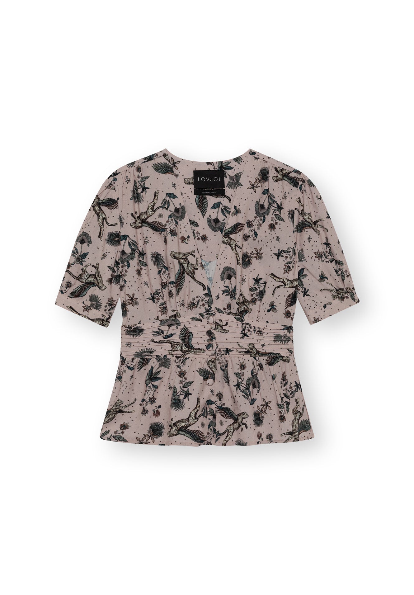 Die LOVJOI Damen Bluse LILLMOR aus weich fließendem 100% LENZING™ ECOVERO™ Viskosefasern mit tiefem V-Ausschnitt und eleganten Raffungen setzt deine Taille gekonnt in Szene. Filigrane bezogene Knöpfe ziehen die Blicke auf sich. Die Rüsche am Saum sorgt für das feminine Extra.