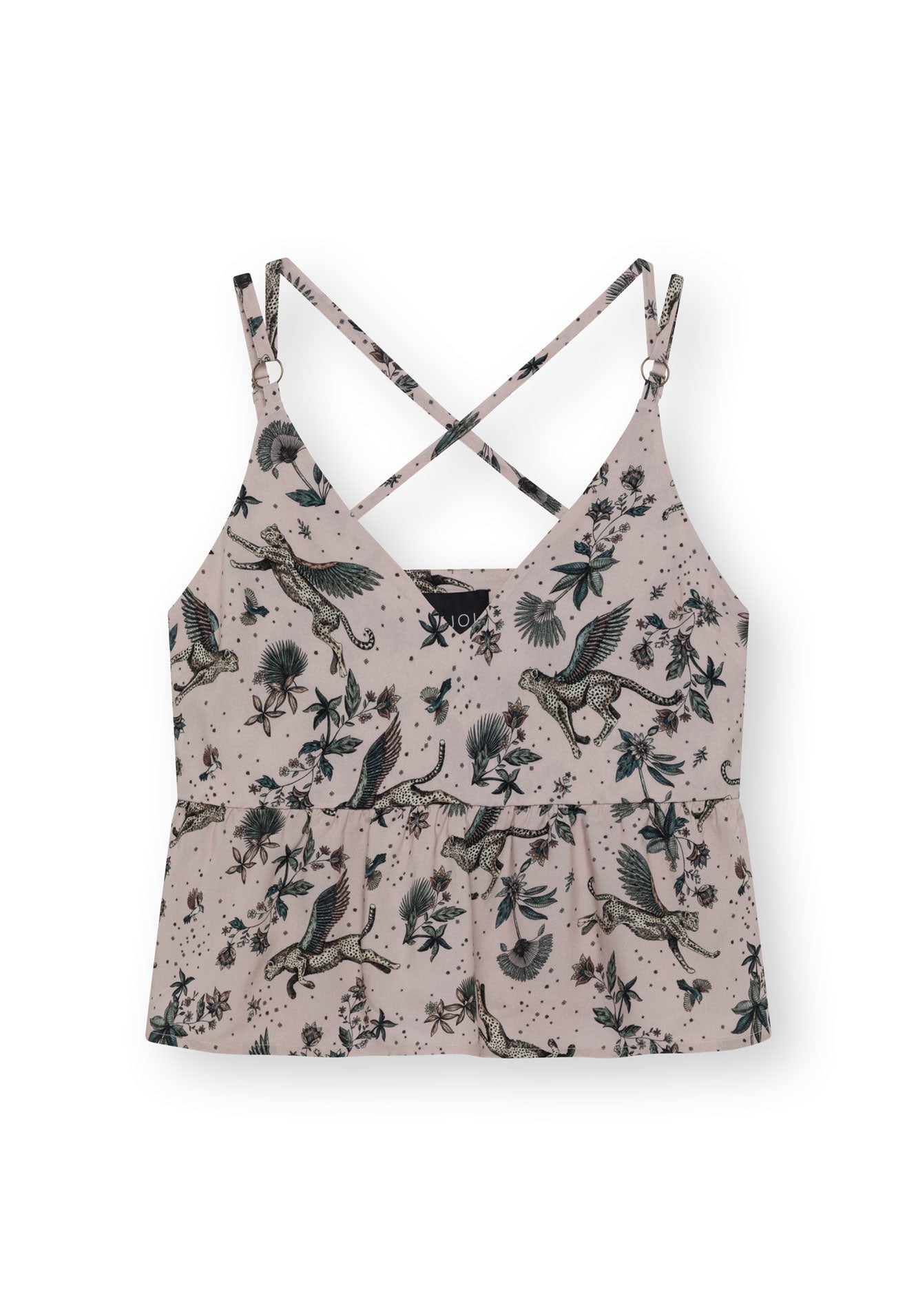 Das LOVJOI Damen Camisole Top RONNIA aus weich fließendem 100% LENZING™ ECOVERO™ Viskosefasern mit Crossbackdetail, verstellbaren Trägern, extravaganter Rüsche am Saum und tiefem V-Ausschnitt zieht die Blicke auf sich.